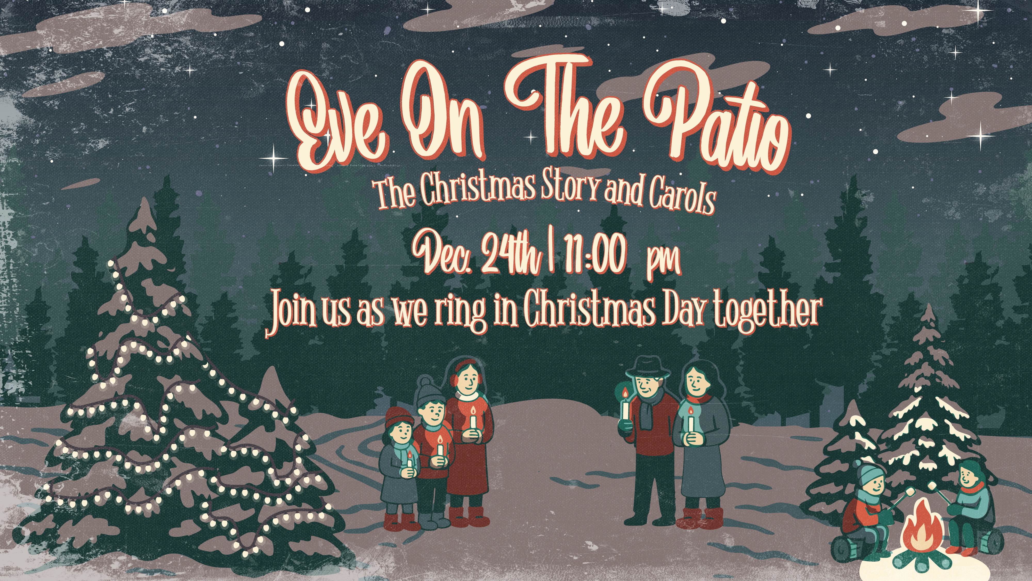 Join us late on Christmas Eve for a peaceful, meaningful moment together. We’ll gather on the patio at 11:00 PM for the reading of the Christmas story, singing carols, and welcoming in Christmas Day as a community. It’s a simple, beautiful way to pause, reflect, and celebrate the birth of Jesus as midnight arrives.